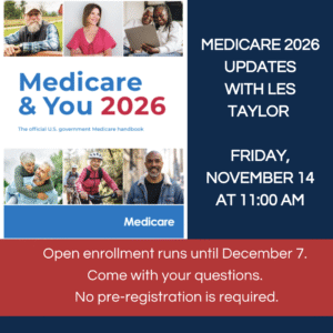Les Taylor, Bankers’ Life, returns to explain Medicare updates for 2026. Medicare open enrollment period runs until December 7. Please bring your questions for Les. No registration is required.