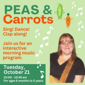 Dance, clap and sing along with Miss Lisa of Peas & Carrots Music! We’ll have lots of fun at this interactive musical program.