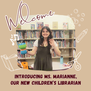 Join us in welcoming our new Children’s Librarian! Ms. Marianne will run our Storytime programs on Tuesday mornings, as well as our Afterschool Programs and special events for children.