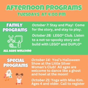 - October 7: Stay and Play. Listen to a story, then play. All ages.