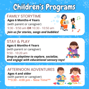 Join us in the Children’s Room for seasonal crafts and programs! Check the schedule for more information.